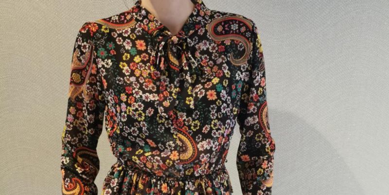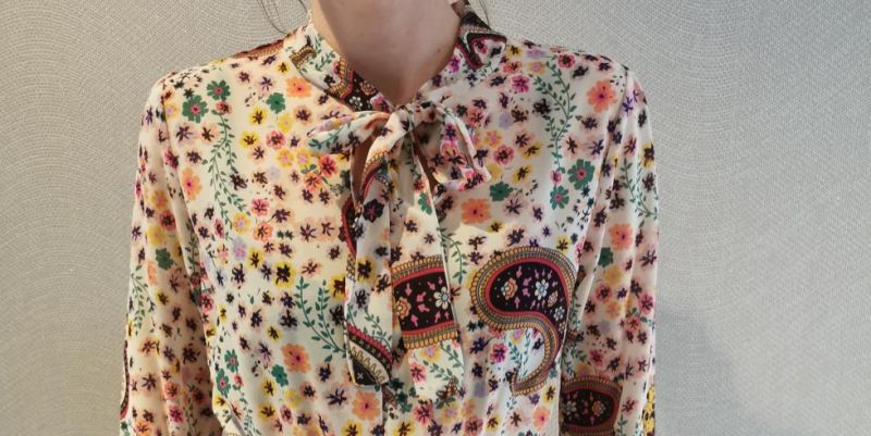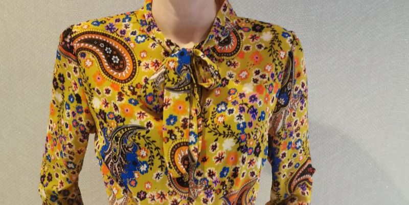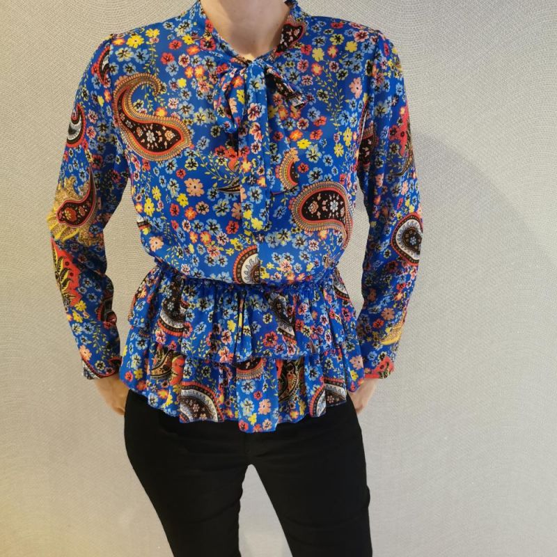 Blouse volantée et imprimée avec ses couleurs pimpantes se porte très bien avec un pantalon uni.