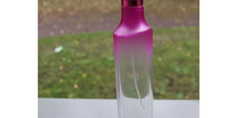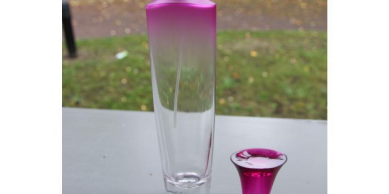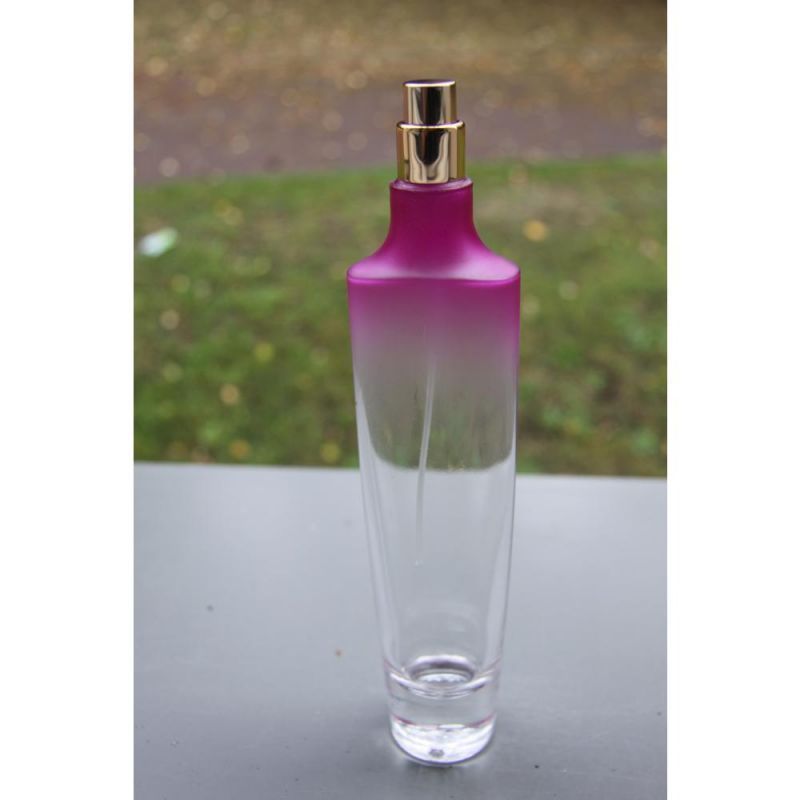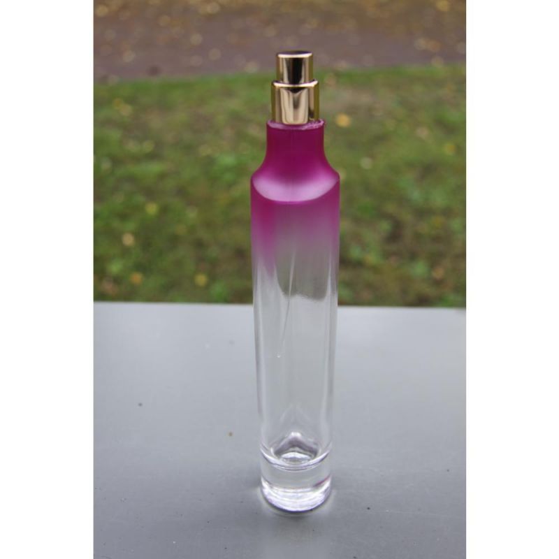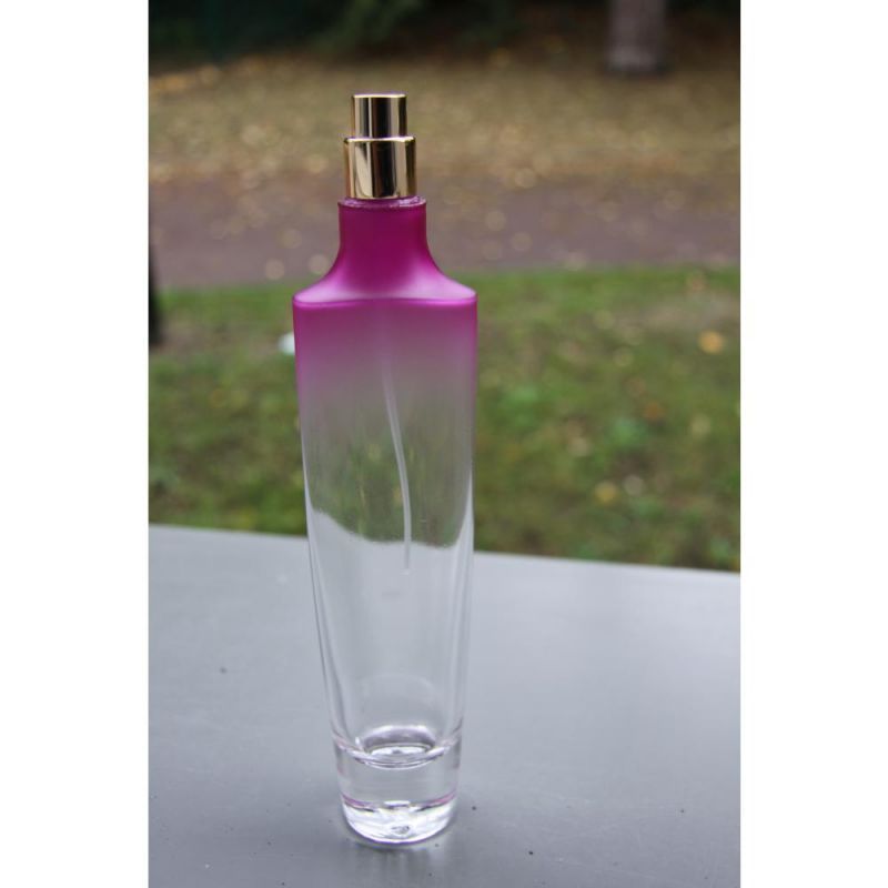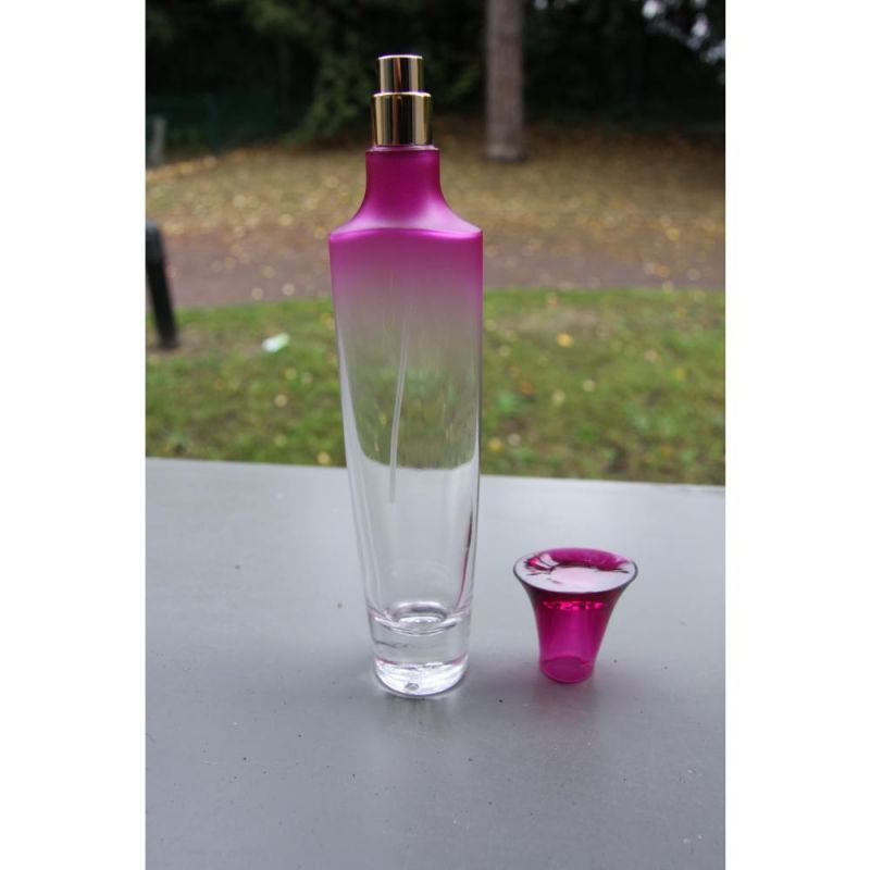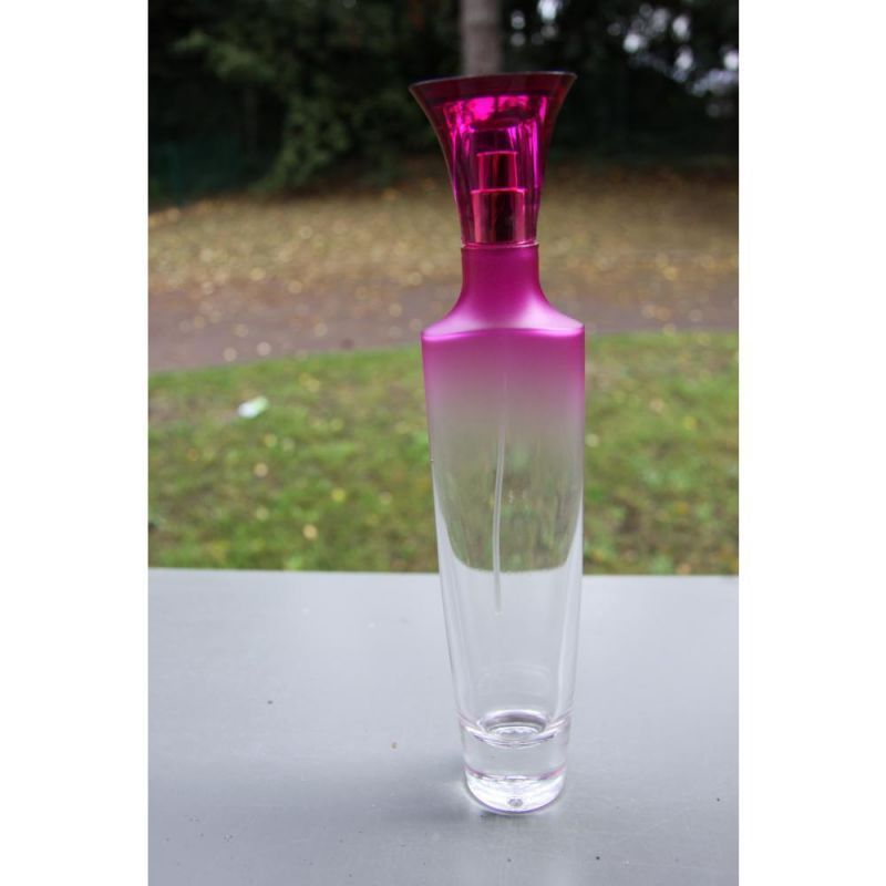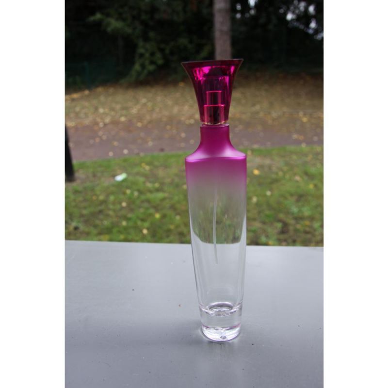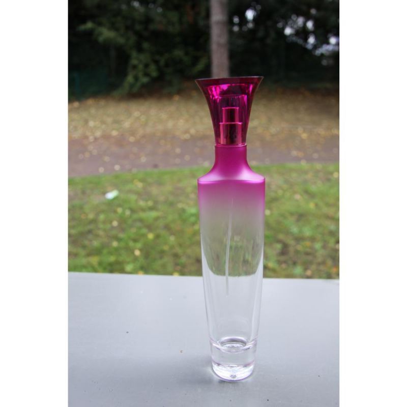Verre transparent , légérement coloré en rouge sur le haut du flacon ( couleur pouvant etre trés facilement retirée)
