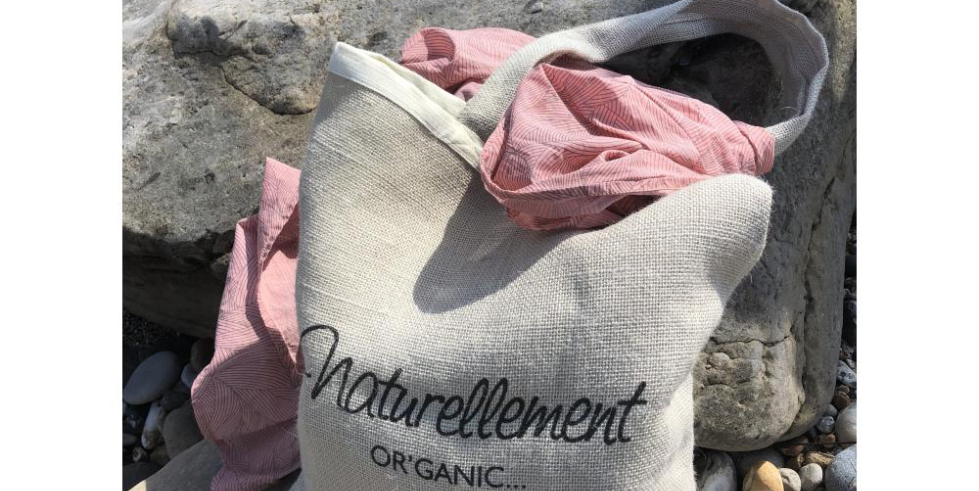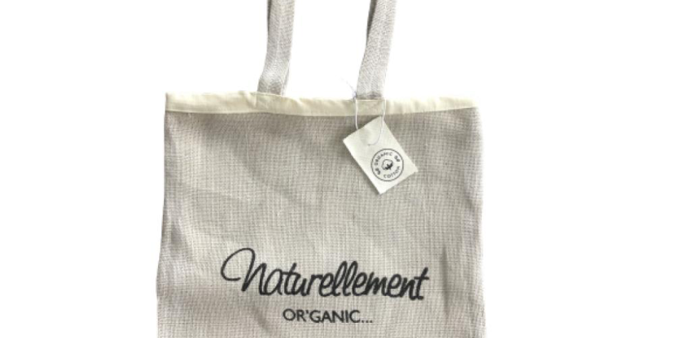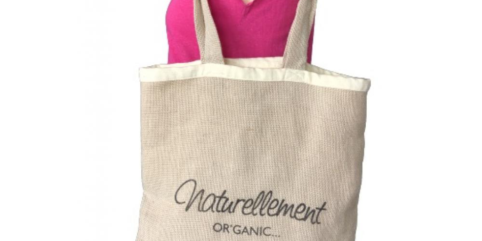 Tote bag naturel en toile de jute avec imprimé placé "Naturellement OR’GANIC" et doublure en voile de coton bio imprimée au nom de la marque "Or'ganic par LC"