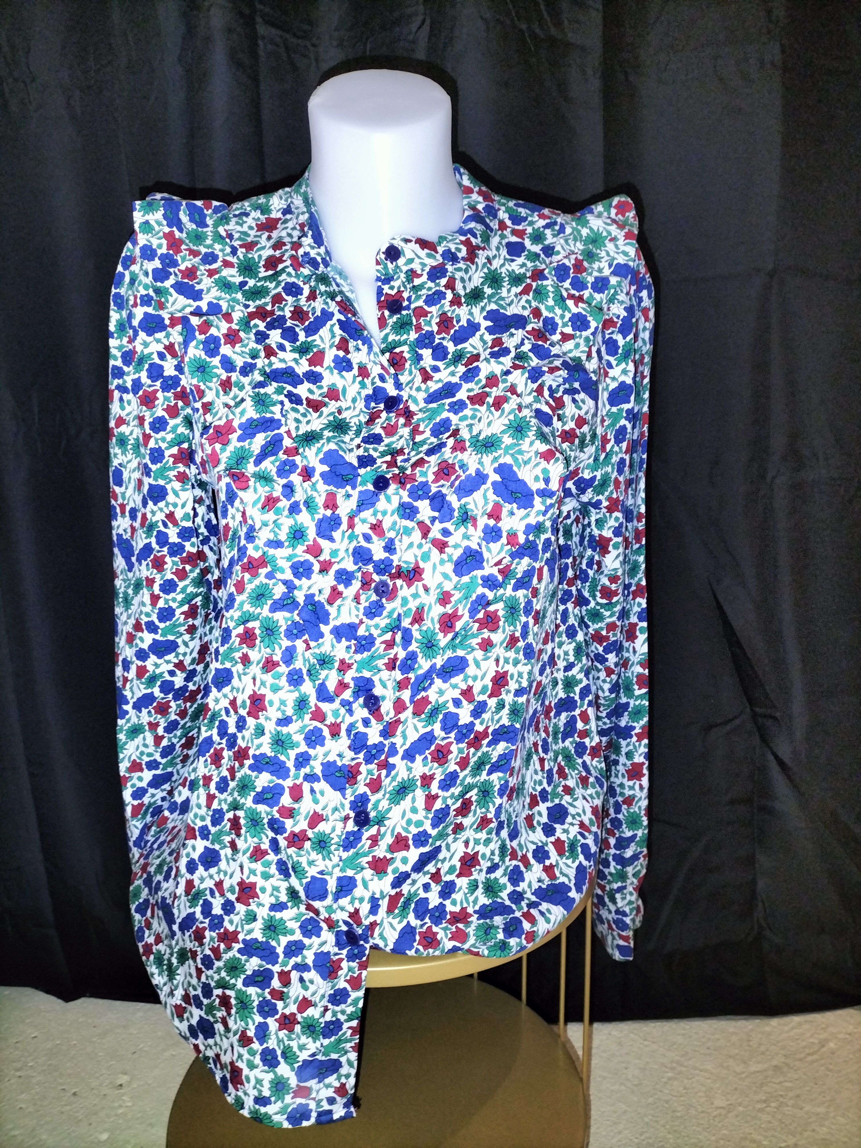 chemisier colorés, bleu vert bordeaux crème,fleurie, petit volant en pointe sur poitrine, T 1 /2viscose