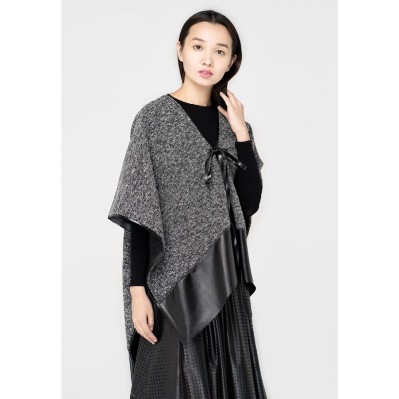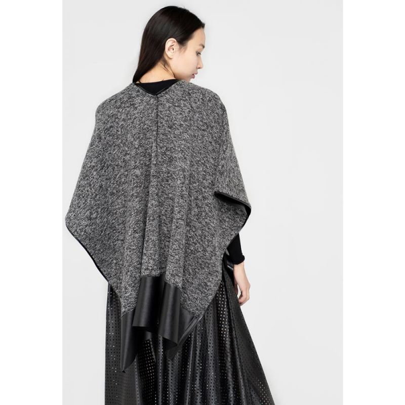 Poncho with eco-leather inserts, front tie, side open, polyester-80%, acrylic-20%, eco-leather: polyethylene-50%, polyamide-50%. Made in Italy