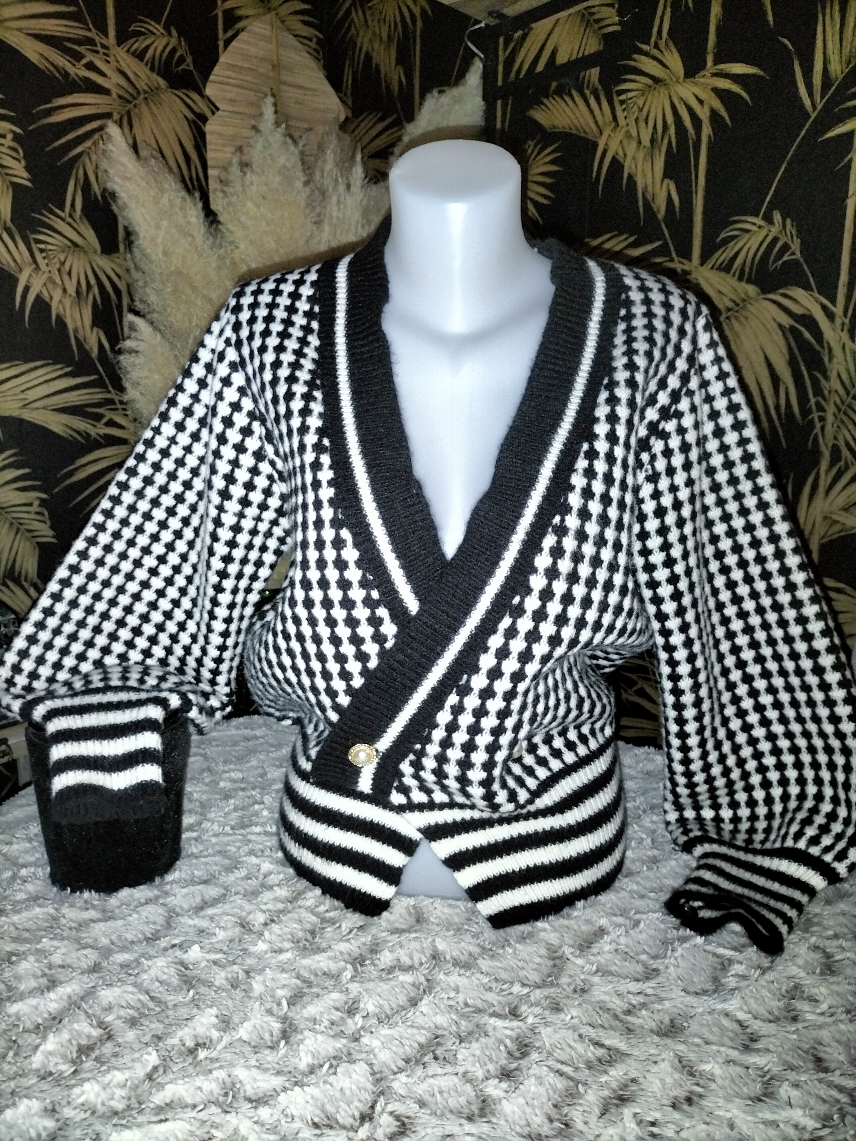 cardigan damier noir et blanc très stylé, élégant, féminin, fermé par bouton perle T unique, Acrylique, viscose, laine, élastane