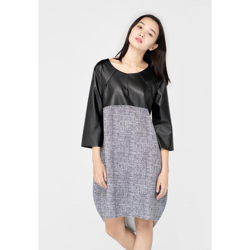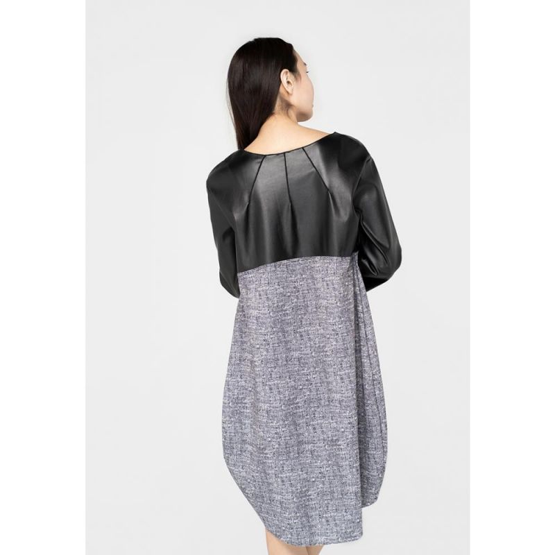 Tunic dress made of combination fabric, outer part and eco-leather sleeves, lower part of gray fabric, SM, ML,