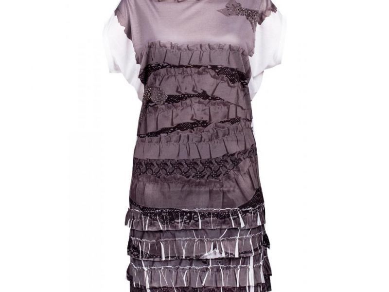 Dress with short print, bottom flounce, short sleeve, summer, ABITO FRAPPE, polyester-100%, ECRU, TIRRENO, NERO. S, M, L. Made in Italy