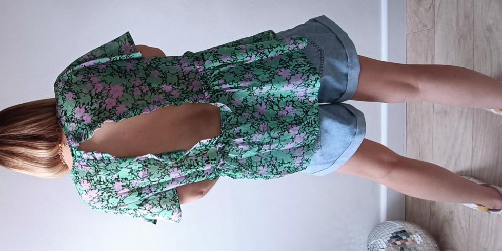Blouse fleurie vert/violet avec liseré doré et argenté