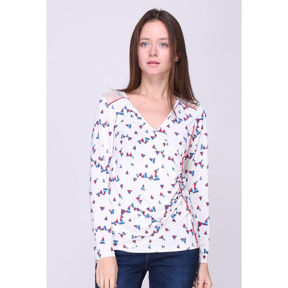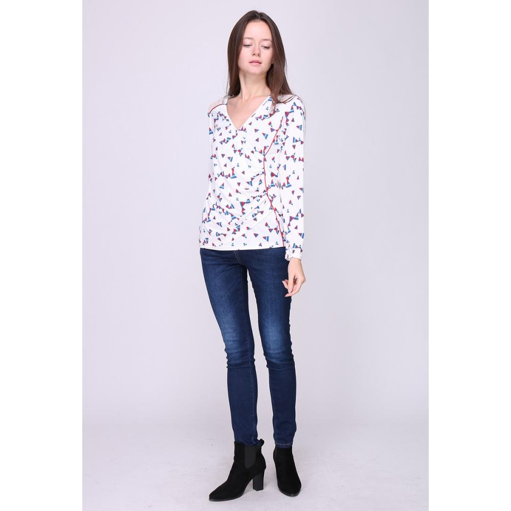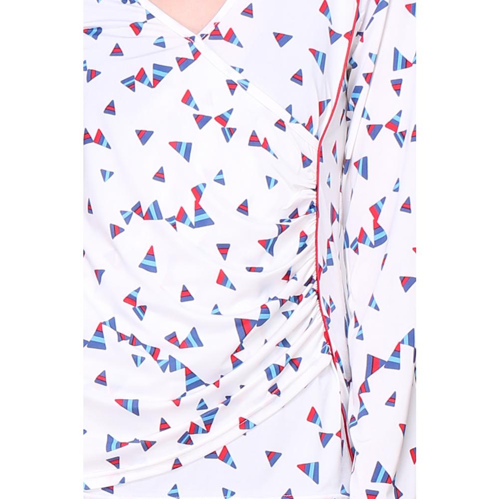 Blouse imprimé triangle, coupe droite, manches longues avec plis vers le bas, col V zippé.